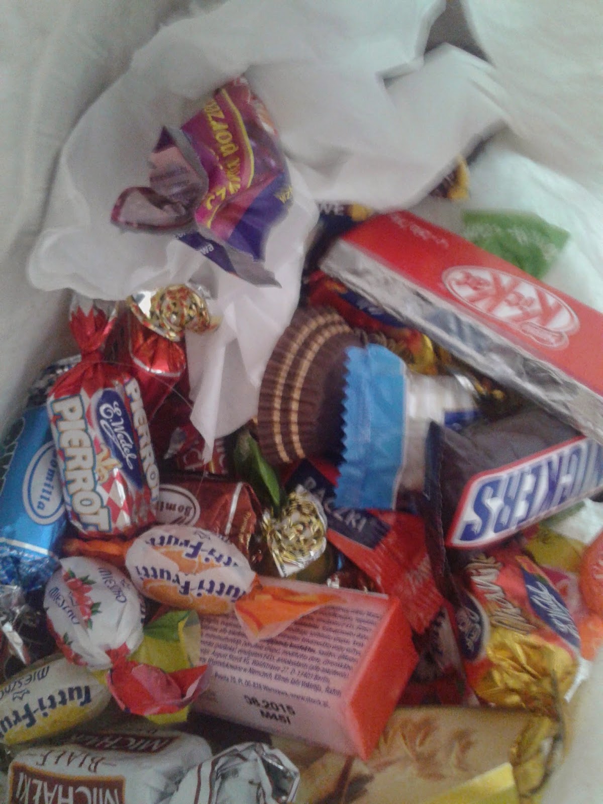 Ja, moje cztery koleżanki i kolega, chodziliśmy po osiedlu, a potem poszliśmy do naszej koleżanki na poczęstunek czyli paluszki wiedźmy, dyniowy torcik i lizak-duch.